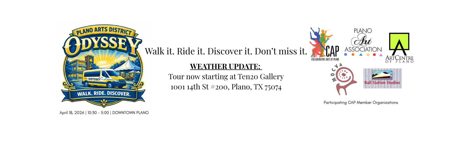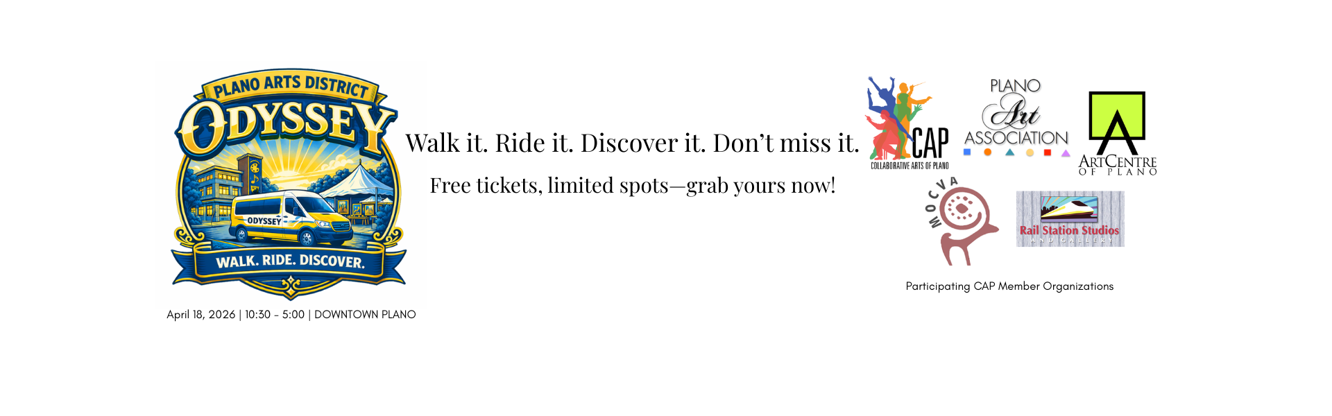 The day will feature a tented pop-up art exhibit and sale presented by the Plano Art Association, located in the parking lot across from the DART station on 15th Place. From this central hub, ticketed guided “discovery tours” will depart, leading participants to a variety of engaging art venues throughout Downtown Plano. Tour stops will include artist studios, galleries, museums, public art installations, and other creative landmarks.